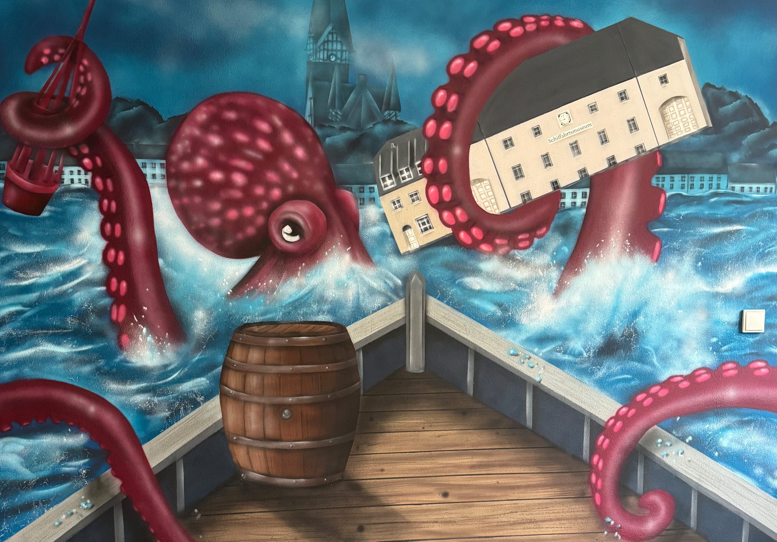 Unsere Idee: Die Besucher sollen nicht nur verkleidet sein – sie sollen sich fühlen, als stünden sie selbst auf einem Schiffsdeck mitten in der Flensburger Förde. Das großflächige Wandbild zeigt eine dramatische Szene: Eine riesige Krake kämpft sich durch die hohe See bei Sturmflut und greift mit einem Tentakel nach einem Miniatur-Modell des Museums selbst. Im Hintergrund erkennt man deutlich die Skyline von Flensburg mit typischen Kirchen – alles inszeniert in dynamischer Perspektive und detailreicher Maltechnik.